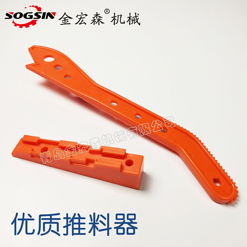 在臺鋸上(或者在臺型電刨上)做直切時,推料桿能讓你的雙手遠離危險。當把一塊很寬的木板直切到寬度小于 4 in(10.16cm)時,推料桿就顯得尤為必要。推料桿有各種不同的形狀,通常是用合成板做的,因為合成板不會像實木一樣在不恰當?shù)臅r候裂。我喜歡那種上頭向前延伸出去的推料桿,在操作時,向前推它的同時保持下壓就可以了。